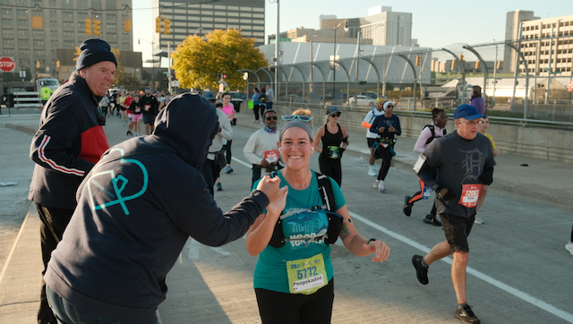 meag completes her first marathon in detroit, reportedly running while full of pizza.
